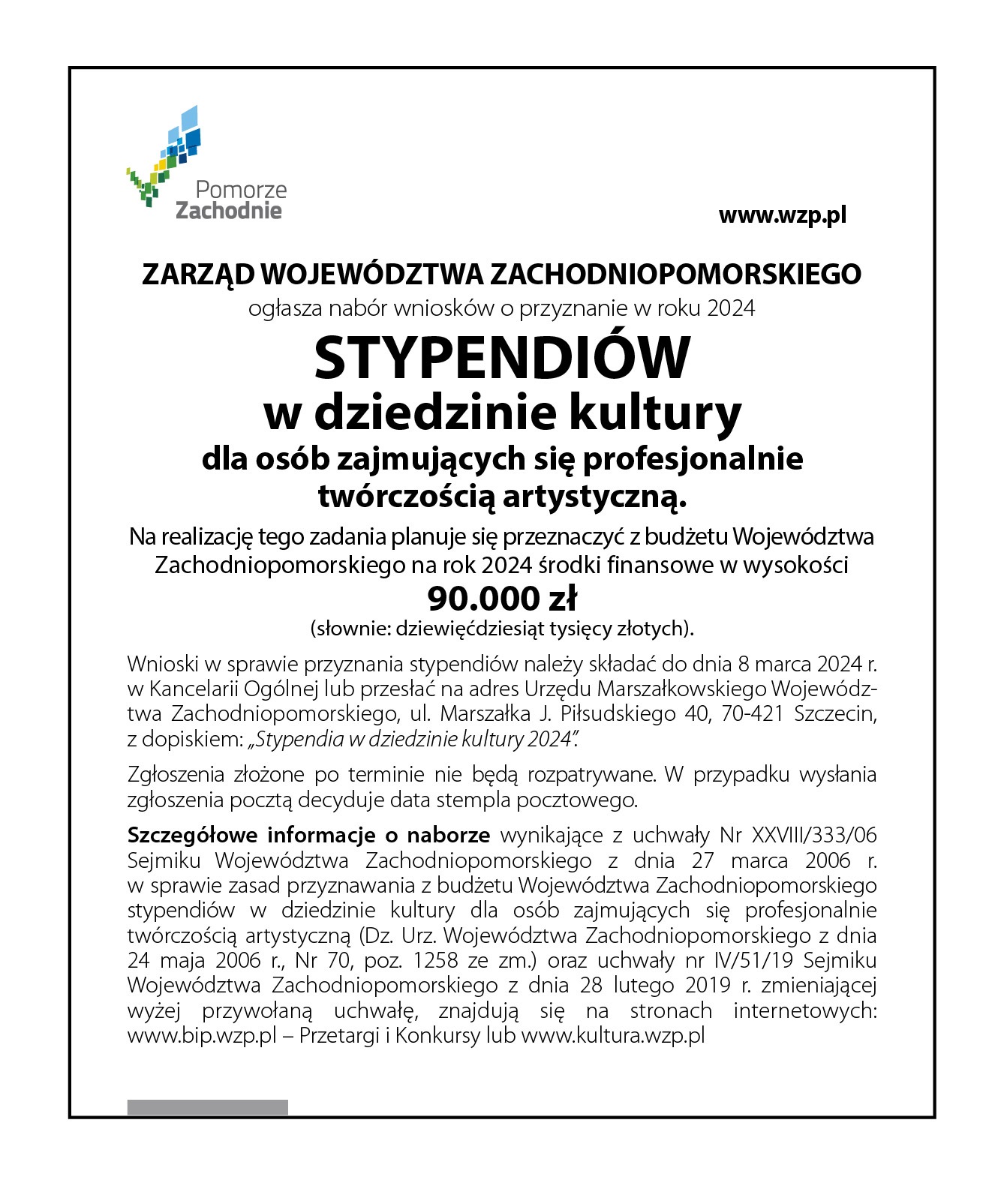 Wnioski w sprawie przyznania stypendium należy składać do dnia 8 marca 2024 r. w Kancelarii Ogólnej lub przesłać na adres Urzędu Marszałkowskiego Województwa Zachodniopomorskiego, ul. Marszałka Józefa Piłsudskiego 40, 70-421 Szczecin, z dopiskiem: „Stypendia w dziedzinie kultury 2024”.